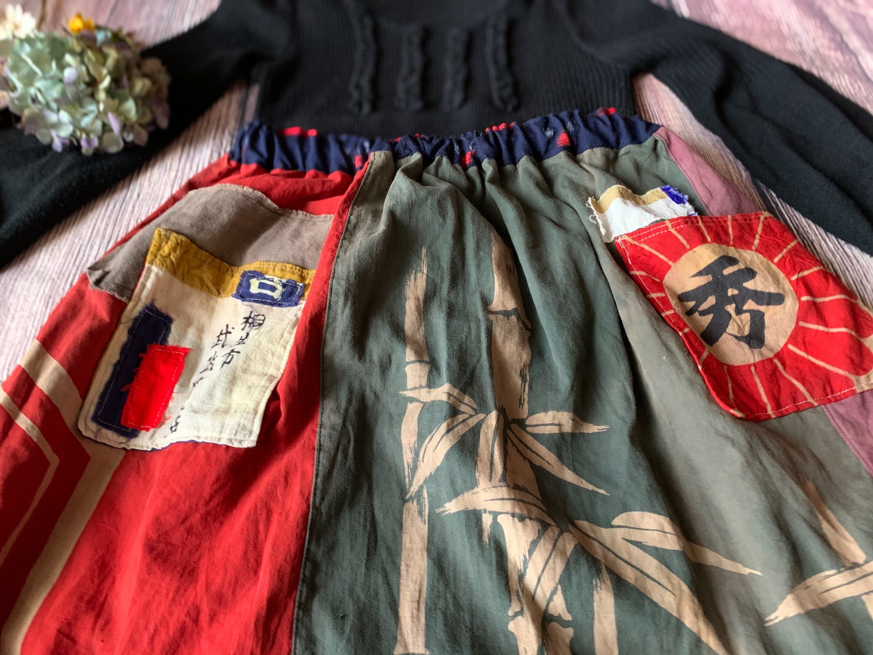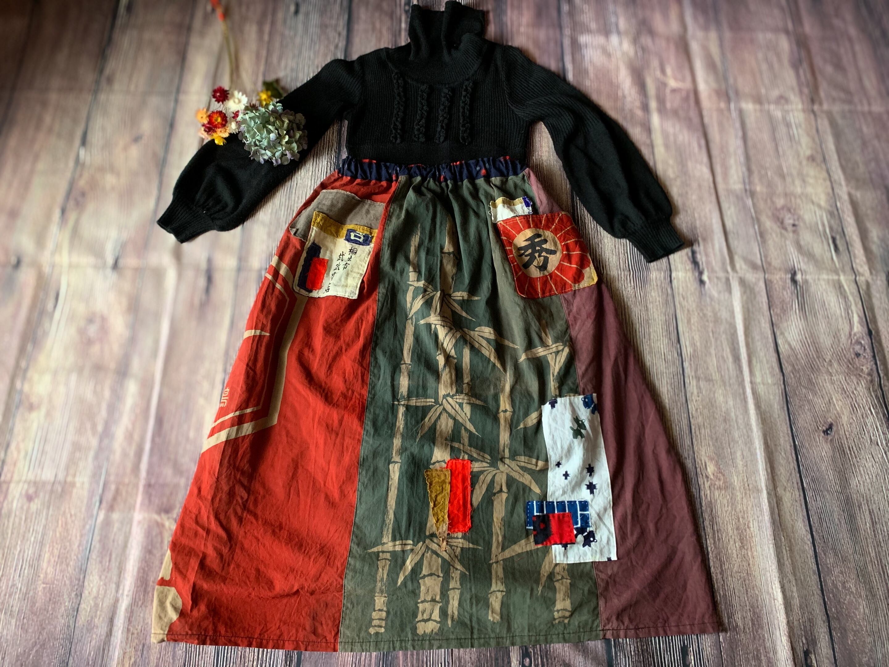 古い幟旗と風呂敷を柿渋で染めてスカートを作りました。