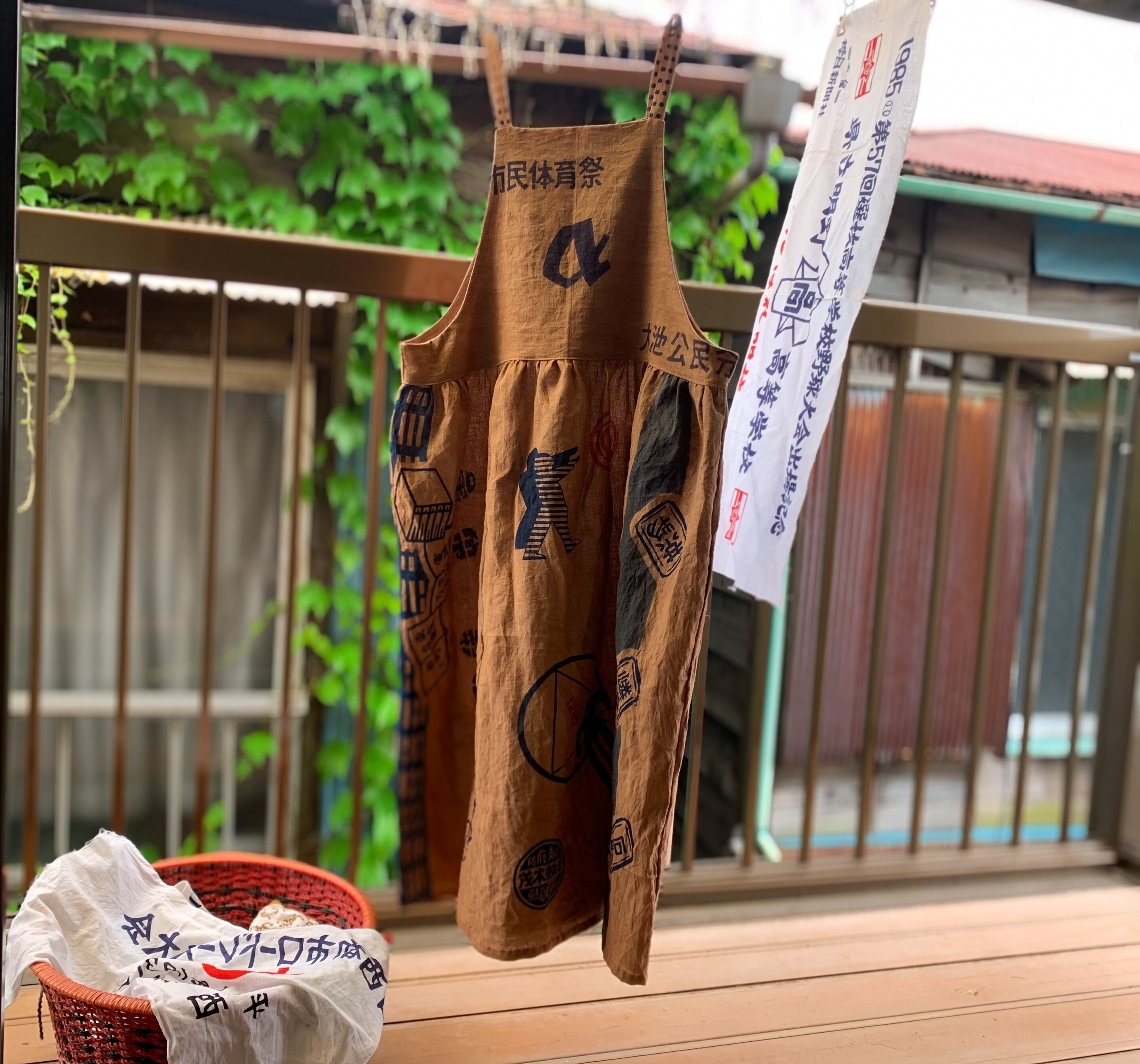 何度も柿渋染めをしたレトロな手ぬぐいからジャンパースカートを作りました。