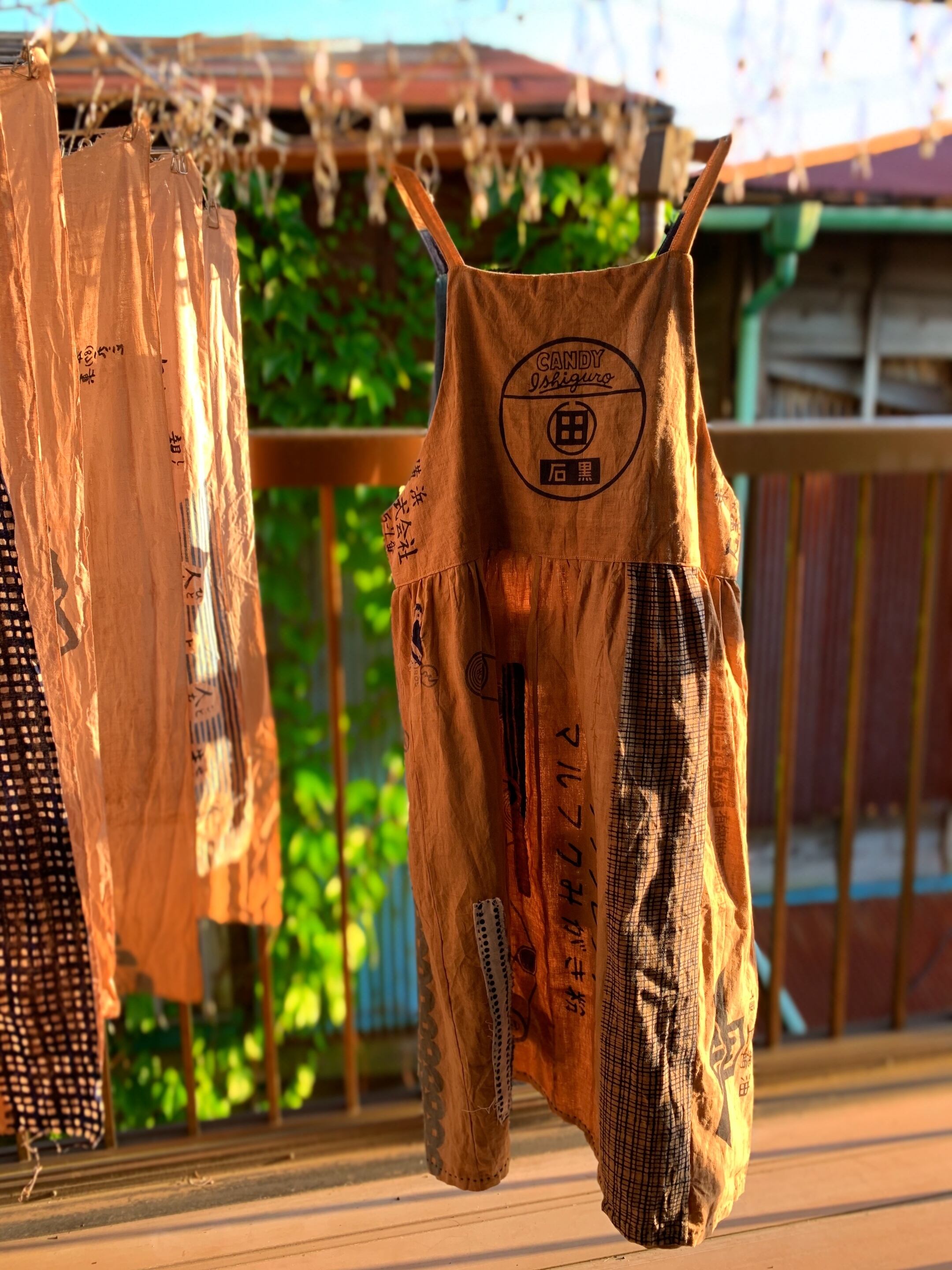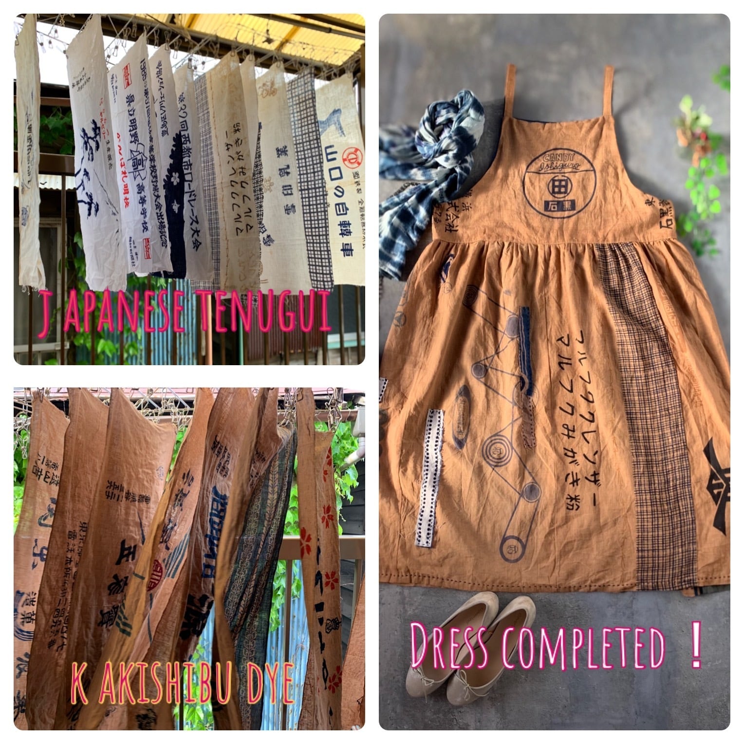何度も柿渋染めをしたレトロな手ぬぐいからジャンパースカートを作りました。