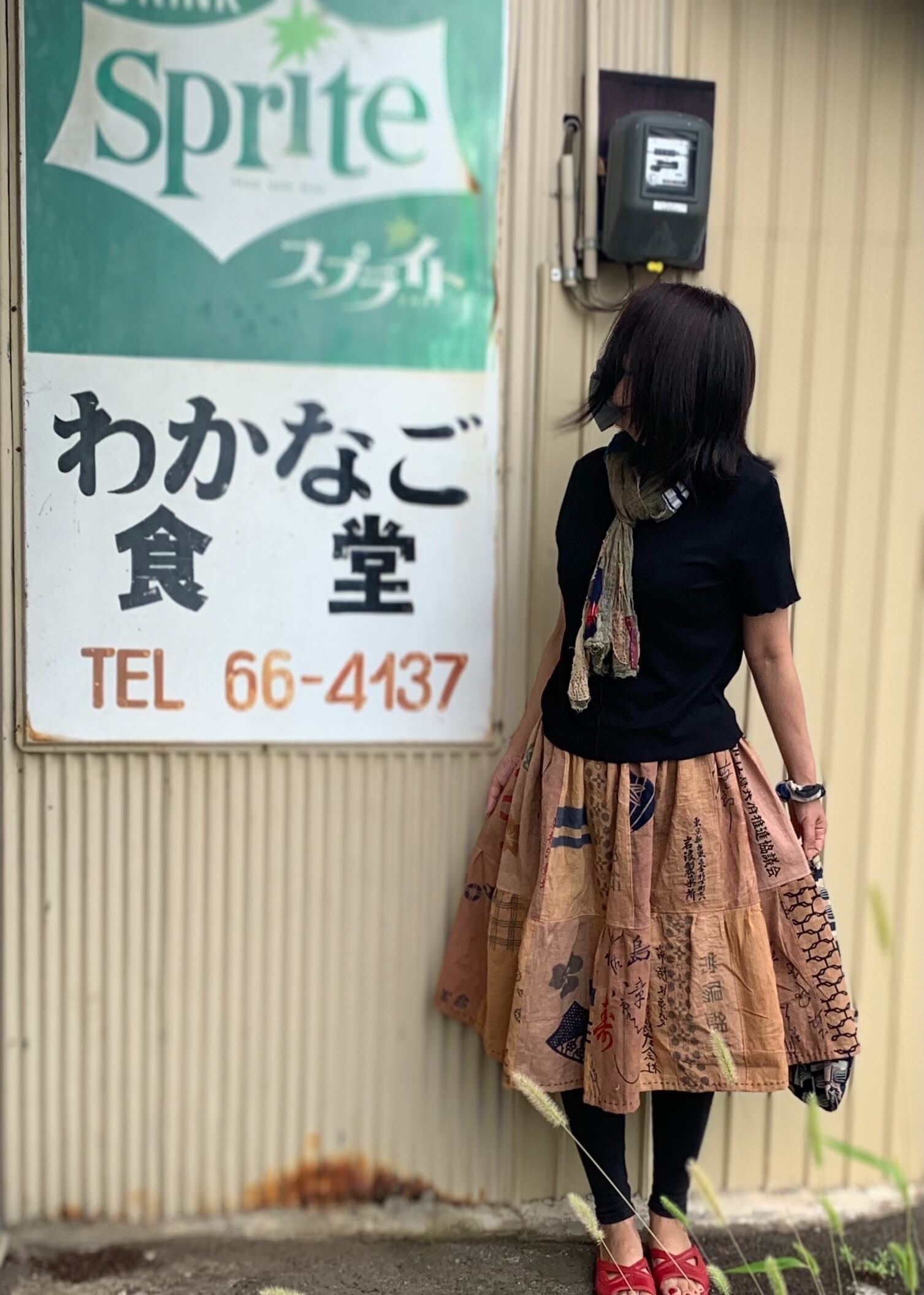 たくさんの柿渋染め手ぬぐいを繋いでティアードスカートを作りました。