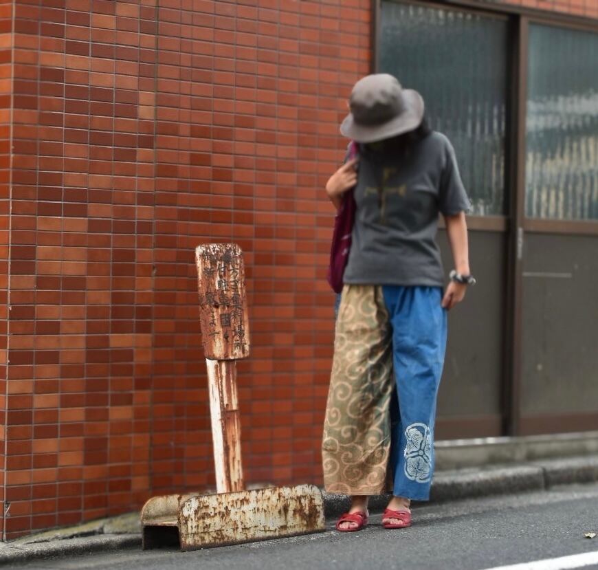 柿渋で染めた唐草模様の風呂敷と紋の入った藍染めの風呂敷でパンツを作りました。
